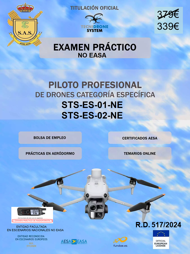 Realiza con nosotros el examen práctico Piloto de DRONES STS para conseguir el certificado oficial de Piloto Profesional de RPAS – categoría específica STS-ES-01-NE y STS-ES-02-NE reconocido por AESA (Agencia Estatal de Seguridad Aérea) de conformidad con el Real Decreto 517/2024 de 4 de Junio.